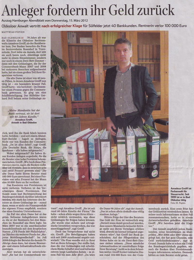 · HAMBURGER ABENDBLATT - 15.03.2012 "ANLEGER FORDERN IHR GELD ZURÜCK" - OLDESLOER ANWALT VERTRITT NACH ERFOLGREICHER KLAGE JETZT 40 BANKKUNDEN. RENTNERIN VERLOR 100.000 EURO.