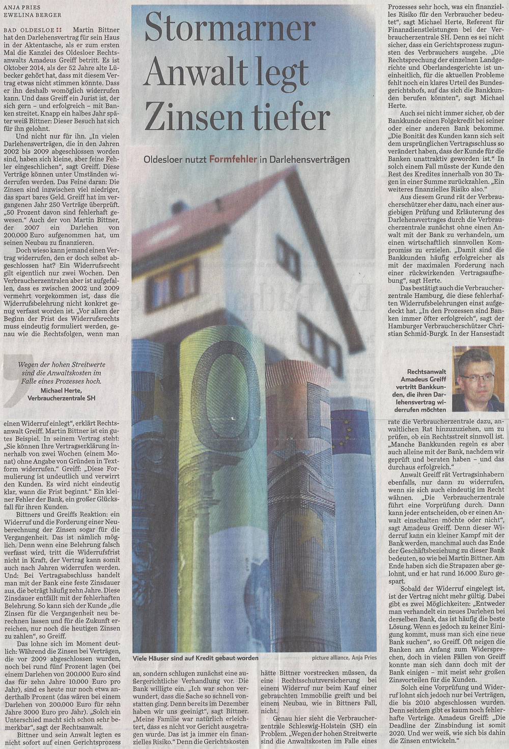 · HAMBURGER ABENDBLATT - 18.03.2015 "STORMARNER ANWALT LEGT ZINSEN TIEFER" OLDESLOER ANWALT NUTZT FORMFEHLER IN DARLEHENSVERTRÄGEN.