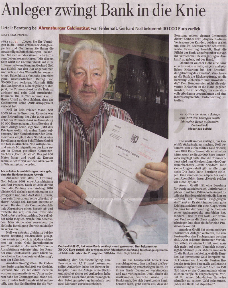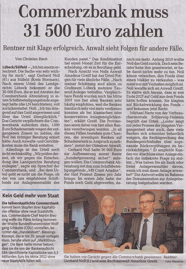 · LÜBECKER NACHRICHTEN 14.01.2012 "COMMERZBANK MUSS 31.500 EURO ZAHLEN". RENTNER MIT KLAGE ERFOLGREICH. ANWALT SIEHT FOLGEN FÜR ANDERE FÄLLE.