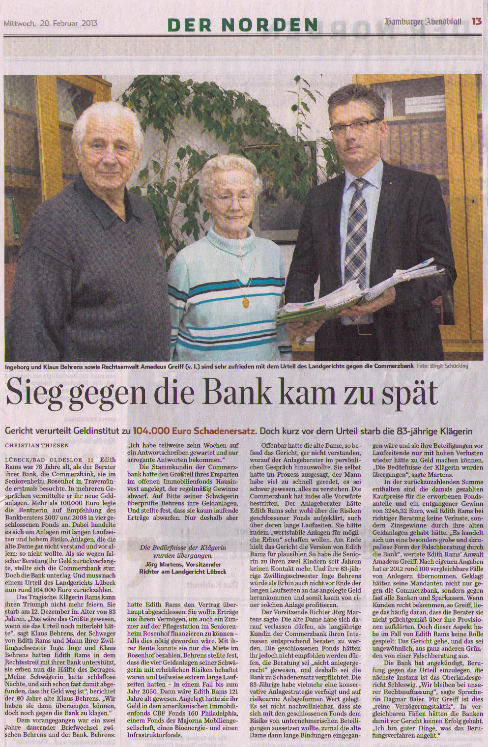 · HAMBURGER ABENDBLATT - 20.02.2013 GERICHT VERURTEILT GELDINSTITUT ZU 104.000 EUR SCHADENERSATZ.