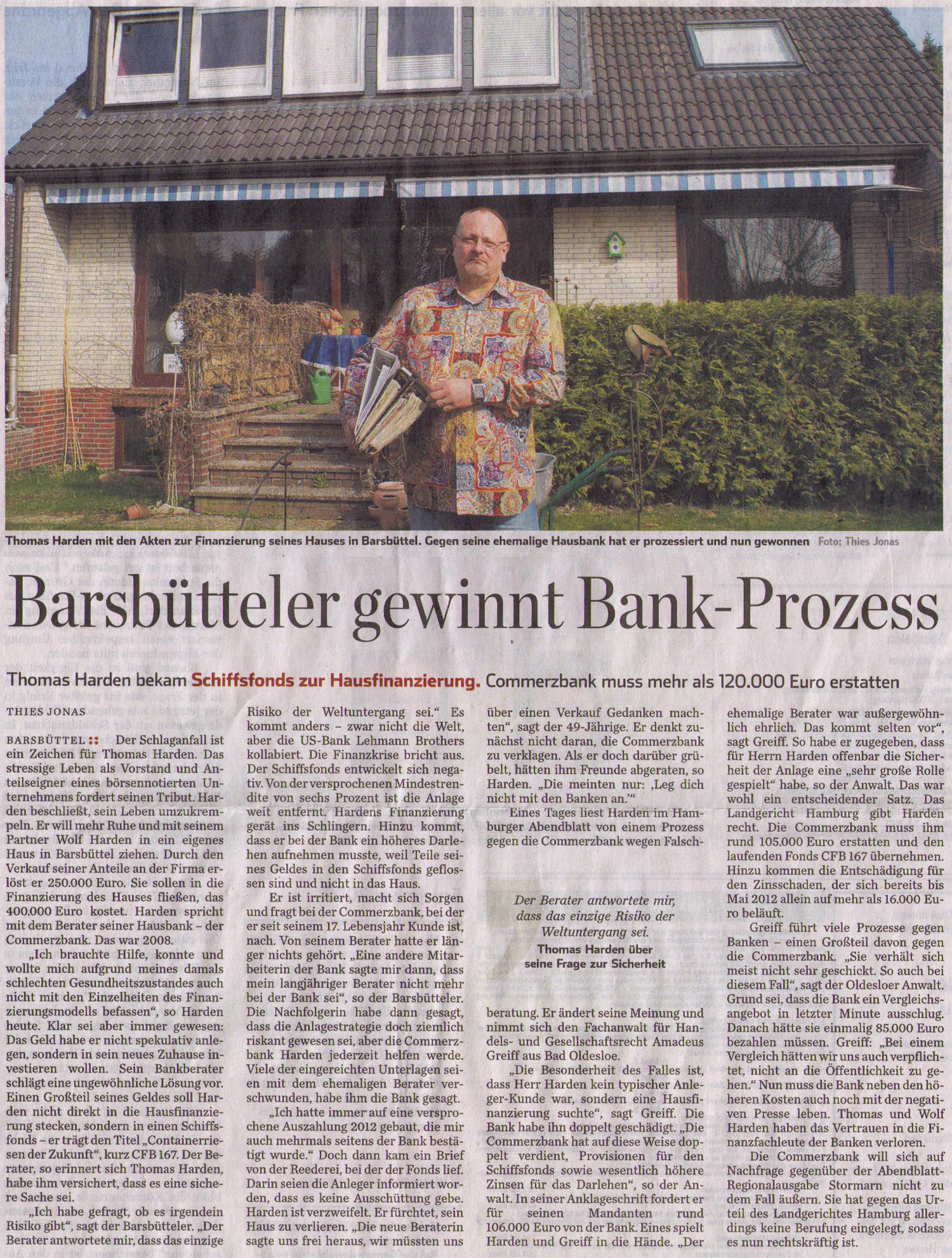 · HAMBURGER ABENDBLATT - 29.04.2013 "BARSBÜTTLER GEWINNT BANKPROZESS" COMMERZBANK MUSS MEHR ALS 120.000 EURO ERSTATTEN.