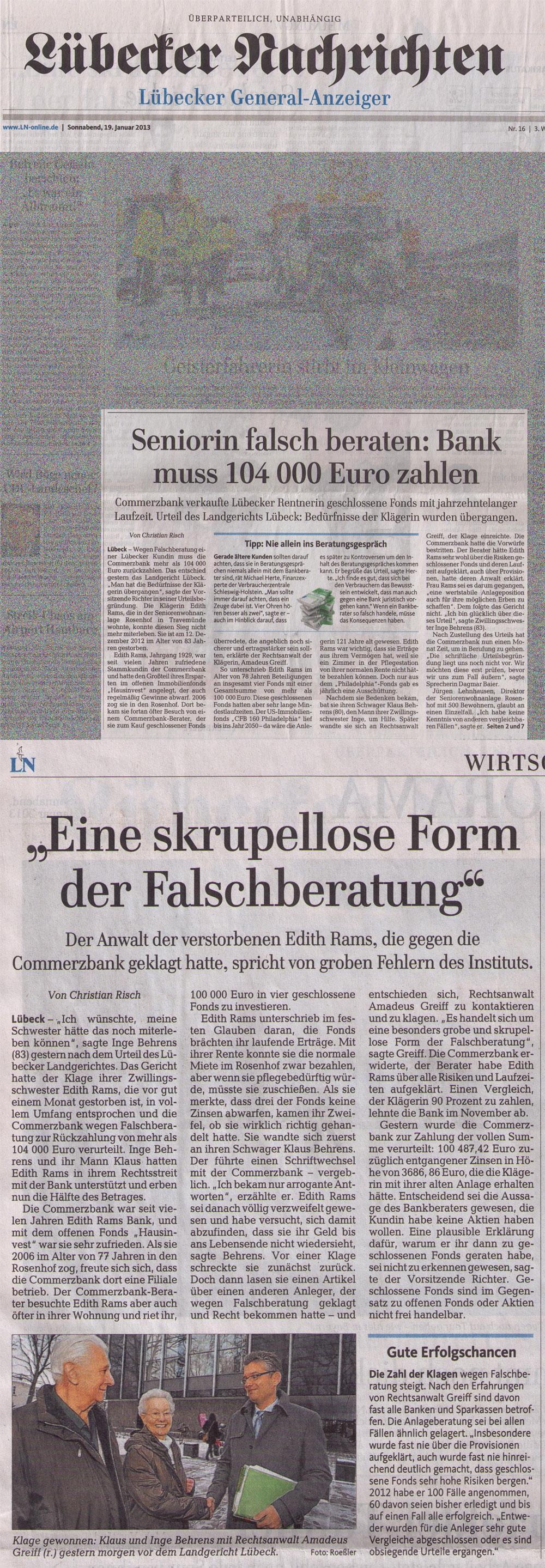 · LÜBECKER NACHRICHTEN 23.01.2013 SENIORIN FALSCH BERATEN: BANK MUSS 104.000 EUR ZAHLEN