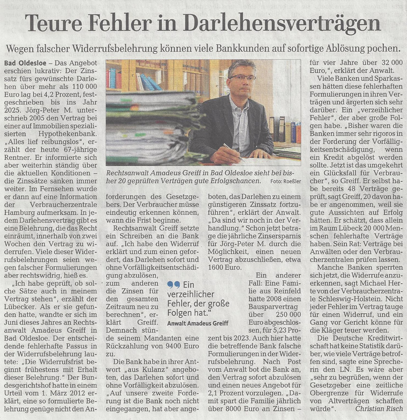 · LÜBECKER NACHRICHTEN - 21.09.2013 "TEURE FEHLER IN DARLEHENSVERTRÄGEN" WEGEN FALSCHER WIDERRUFSBELEHRUNG KÖNNEN VIELE BANKKUNDEN AUF SOFORTIGE ABLÖSUNG POCHEN.