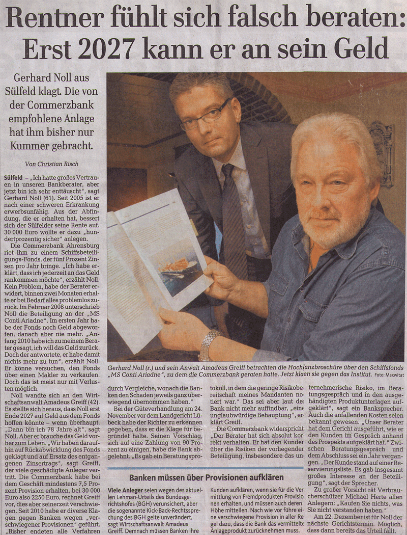 · LÜBECKER NACHRICHTEN 27.11.2011 "RENTNER FÜHLT SICH FALSCH BERATEN: ERST 2027 KANN ER AN SEIN GELD" - GERHARD NOLL AUS SÜLFELD KLAGT. DIE VON DER COMMERZBANK EMPFOHLENE ANLAGE HAT IHM BISHER NUR KUMMER GEBRACHT.