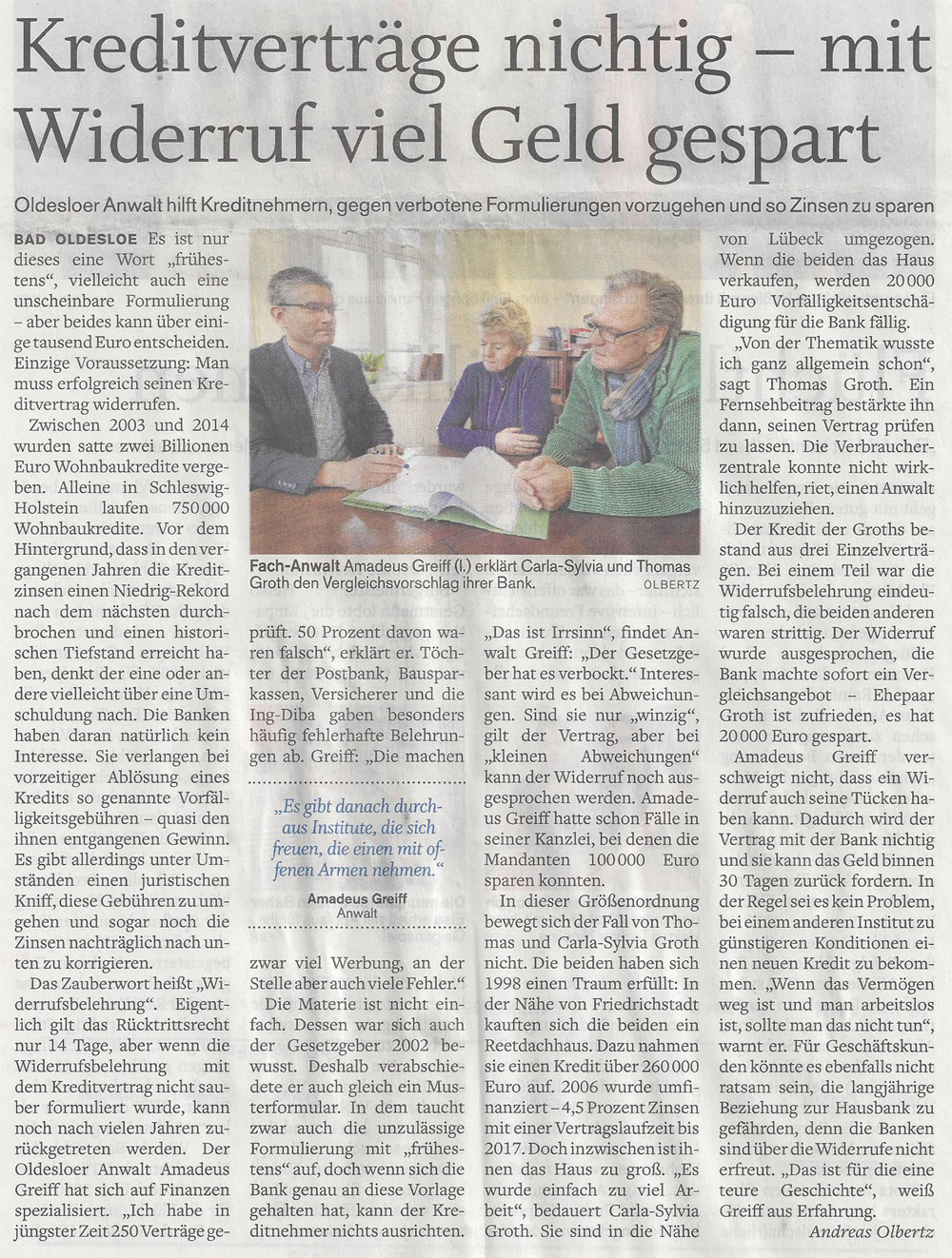 · STORMARNER TAGEBLATT - 03.02.2015 "KREDITVERTRÄGE NICHTIG - MIT WIDERRUF VIEL GELD GESPART" OLDESLOER ANWALT HILFT KREDITNEHMERN, GEGEN VERBOTENE FORMULIERUNGEN VORZUGEHEN UND SO ZINSEN ZU SPAREN.