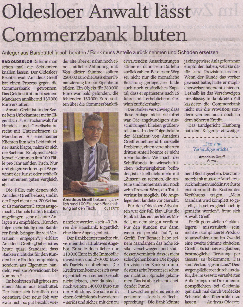· STORMARNER TAGEBLATT 10.04.2013 "OLDESLOER ANWALT LÄSST COMMERZBANK BLUTEN" ANLEGER AUS BARSBÜTTEL FALSCH BERATEN / BANK MUSS ANTEILE ZURÜCKNEHMEN UND SCHADEN ERSETZEN